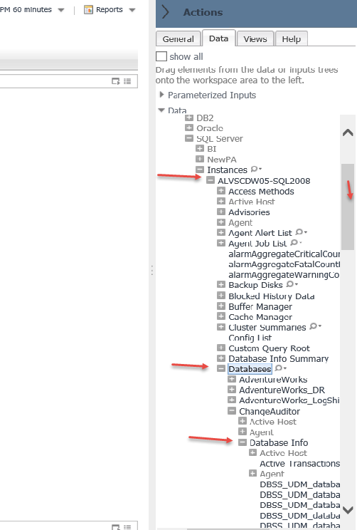 But, we’re getting ahead of ourselves a bit. First we need to add that metric, “SQL Data Files Size MB” to our still-blank custom report. Where should we “drag” it from in the data tree on the right-side Action panel?
