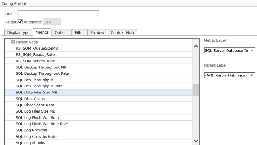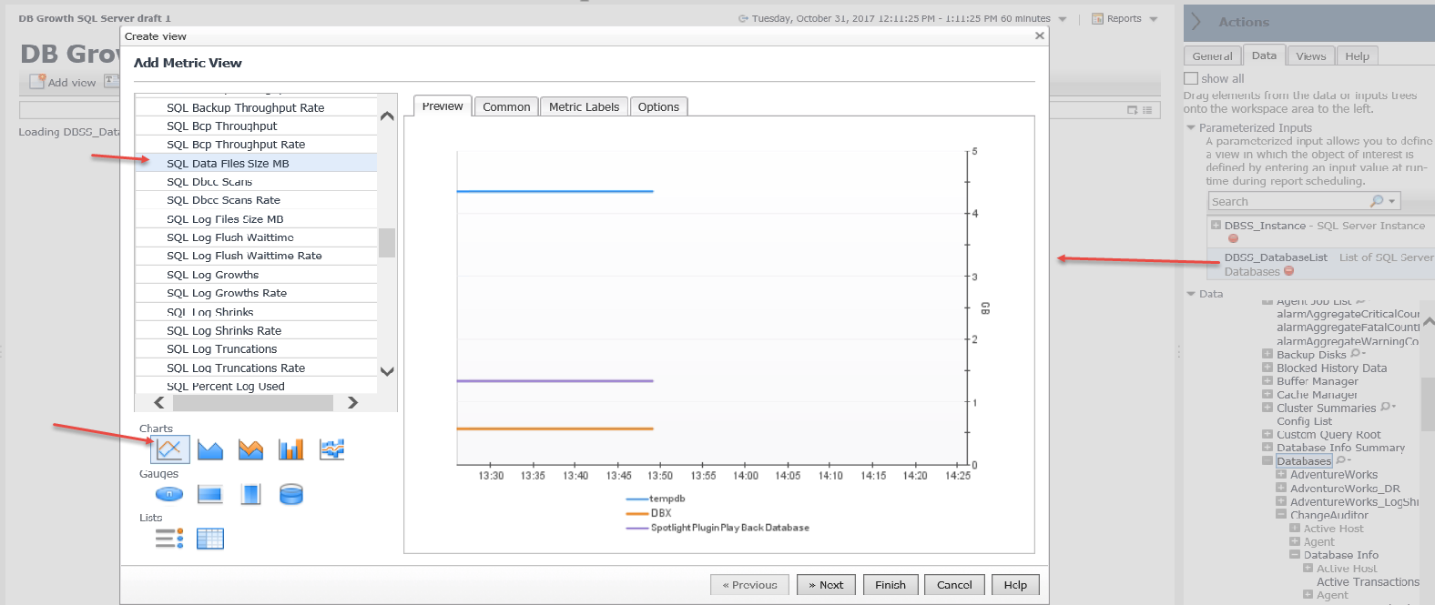 IMPORTANT: The metric “SQL Data Files Size MB” must be dragged over from the parameterized ‘list of databases’ (then, find “Database Info” to locate the metric) to allow the selection of databases to display. If we simply drag the metric over from the instance or from the lower part of the Action panel data tree, all the databases on the selected instance will appear on the graph every time…there won’t be any run-time selection possible.
