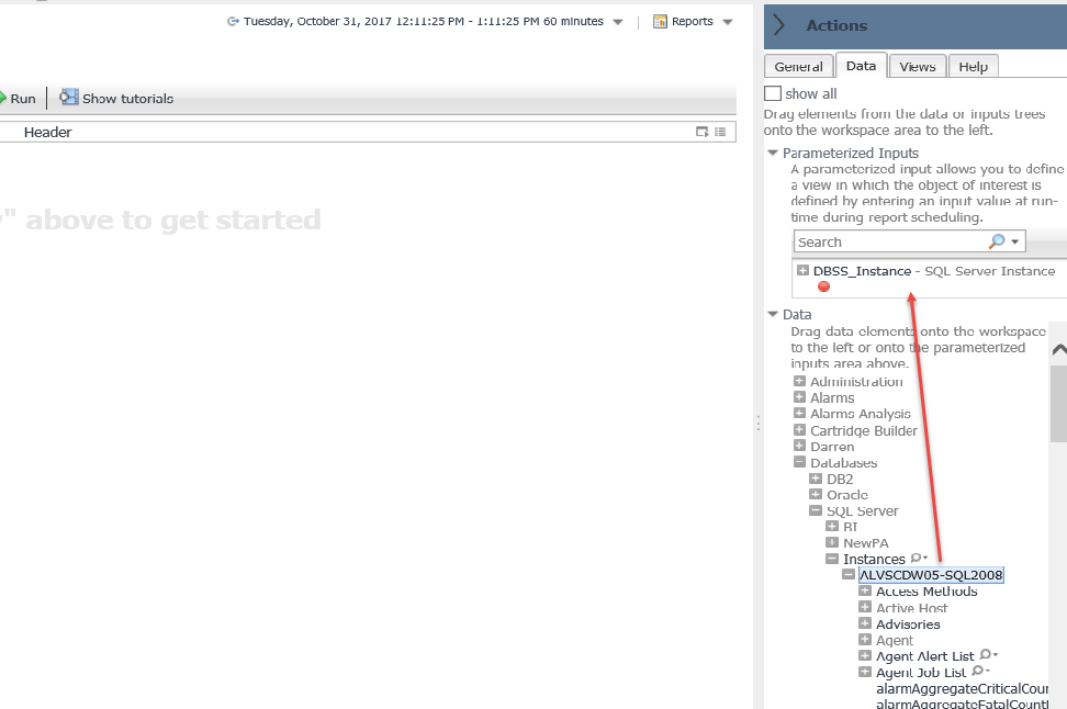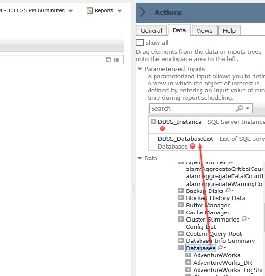 To fulfill the requirement that a selected instance be displayed on the report each time it is generated, we’ll need to provide that selectivity by dragging a SQL Server instance up to the “parameterized inputs” area on the Data tab: