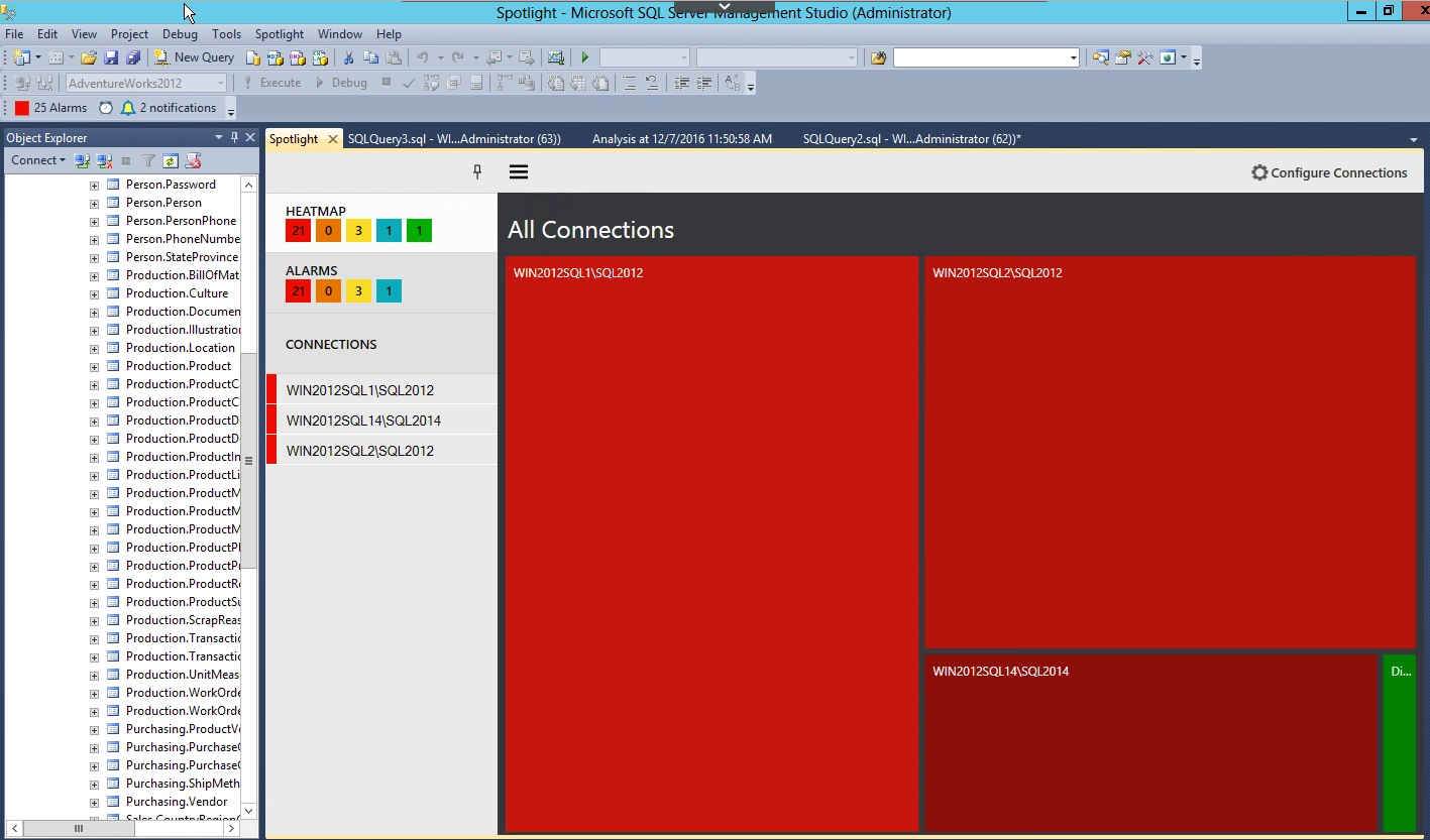 Many people working with SQL Server use Microsoft’s SQL Server Management Studio. In many cases, they spend every day working with this solution. Fortunately, we provide a plug-in, called Spotlight Developer, that allows you to connect to your existing Spotlight on SQL Server Diagnostic Server. By doing so, you’ll be able to quickly see a synopsis of the alarms generated: