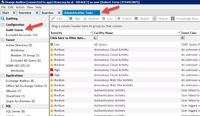 In the Excel spread sheet attached, you can sort by any column or search for specific content by clicking on the arrow down button next to any column name. Select an option from the drop down list or type in a key word to focus on a specific License Type, Facility Name or Event Type. There are 2 sheets in the Excel Spread Sheet: Change Auditor Events and Sample Configuration. The 1st sheet is missing the “Severity” and “Status” column to keep things simple. The 2nd sheet is a list of the same events that include the “Severity” and “Status” columns the way they are configured in my environment. The events in your environment may be configured differently and therefore the Severity and Status may be different. There’s really no right or wrong way to configure these events. How they are configured will depend on the requirements of your environment.