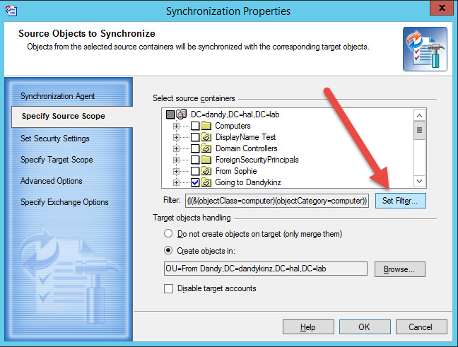 One trick to ensuring only wanted AD objects are merged or created on your target Active Directory is to set an attribute on objects in source AD and then create an LDAP filter to find it. For example, using ADSIEdit.msc you could set on user “John Smith” the following, ExtensionAttribute=SYNCME. The configure your sync to find this object only as follows.
