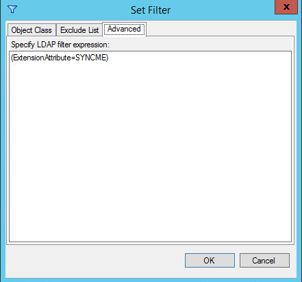 Therefore adding the LDAP filter as follows, for example, will set the LDAP filter to find all object with (ExtensionAttribute=SYNCME)