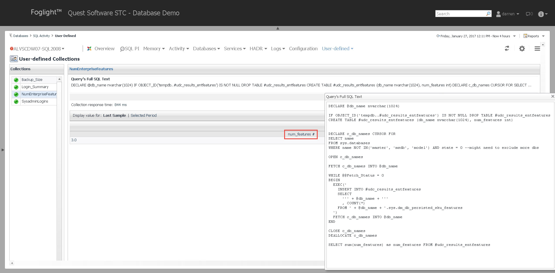 One of the powerful features of Foglight for Oracle and Foglight for SQL Server is the ability to enter your own database queries (SQL) and have the Foglight collector execute these and return data. Trent Mera wrote a great blog on this topic called User-Defined Collections (UDC).
