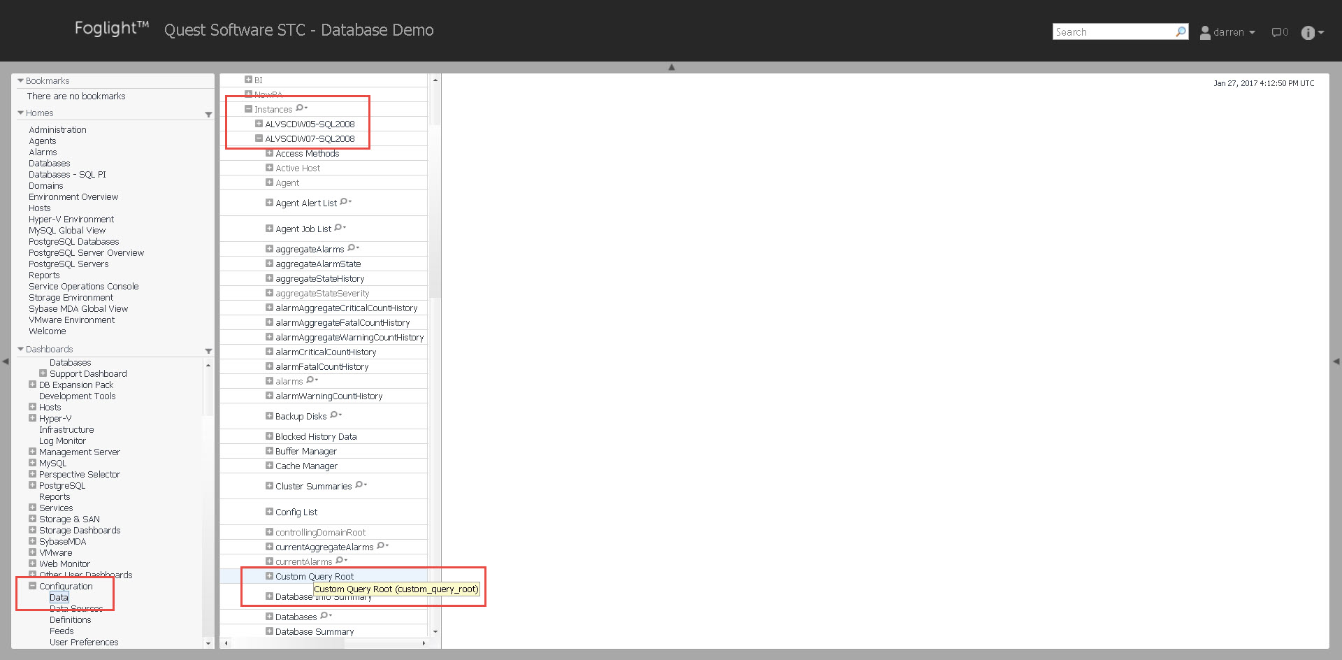 Next we need to find where the data from the UDC “lives”. Navigate to Configuration -> Data and expand the Databases node followed by either Oracle or SQL Server. Next expand the Instances node followed by the instance name that has a UDC. We are looking for “Custom Query Root.” Find that and expand it.
