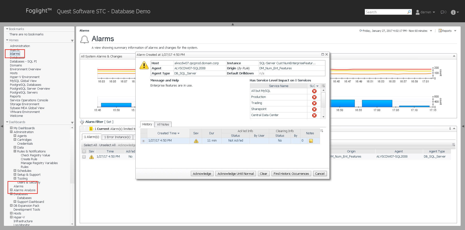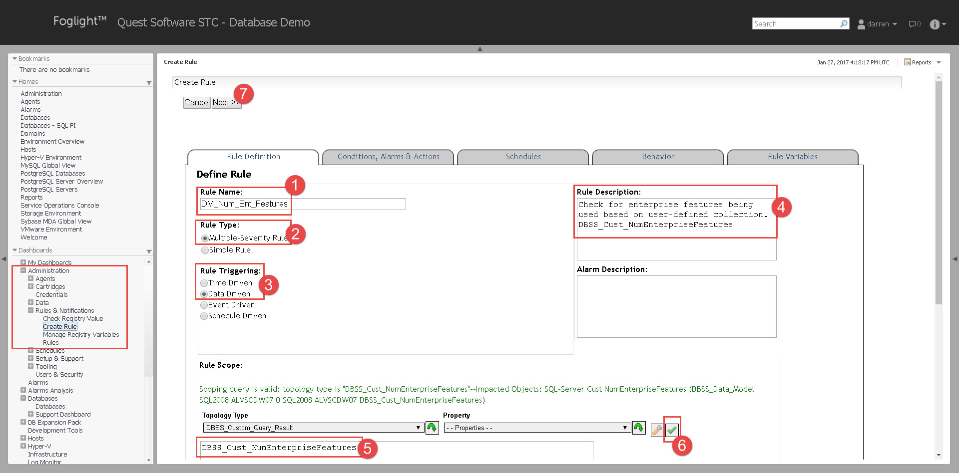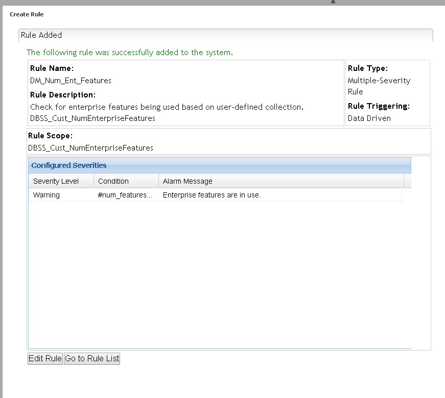 For a user-defined collection, the “User-Defined” drilldown on the Databases dashboard can be used. This SQL text was created to check if there are any enterprise-level features being used in any SQL Server database. It then returns a number. Perfect for an introduction to writing custom rules! The end result will be an alert (alarm) whenever the use of an enterprise feature is detected.