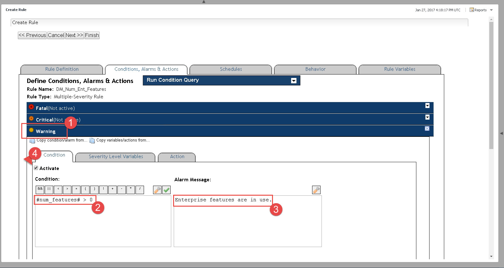 Note: Severity level variables and alarm actions can be added here as well. For other use cases, registry variables can be created so that condition values aren’t hard-coded. In this case, it’s either 0 or > 0 to evaluate, so that step was skipped.