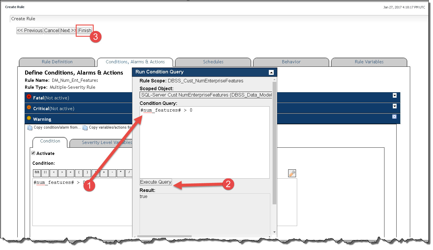 Back in this post, the “Run Condition Query” function was shown. It can be used here to validate our condition logic. Simply copy the condition and execute the query. It evaluates to true for the Scoped Object shown, which means the rule would fire once saved.