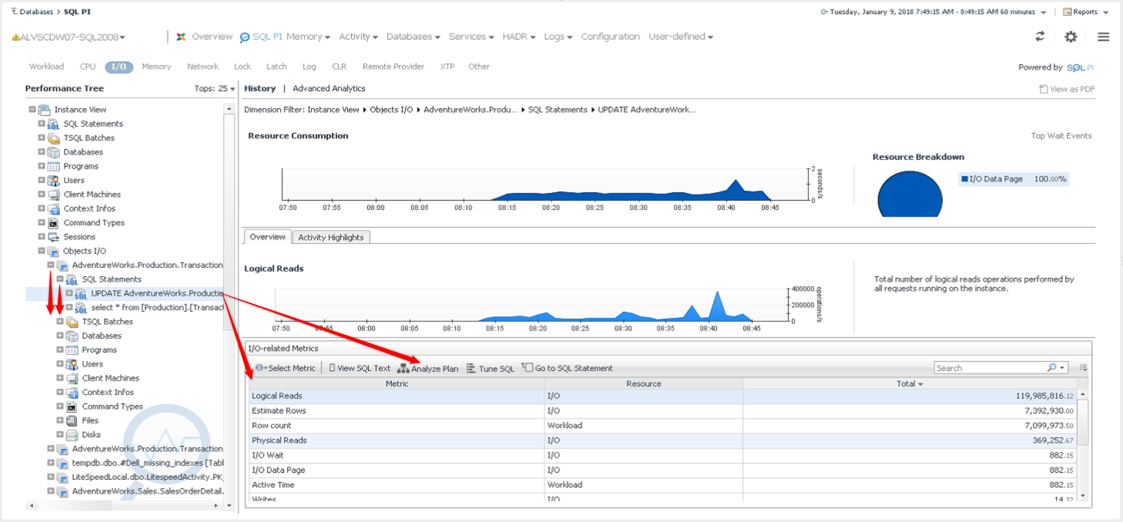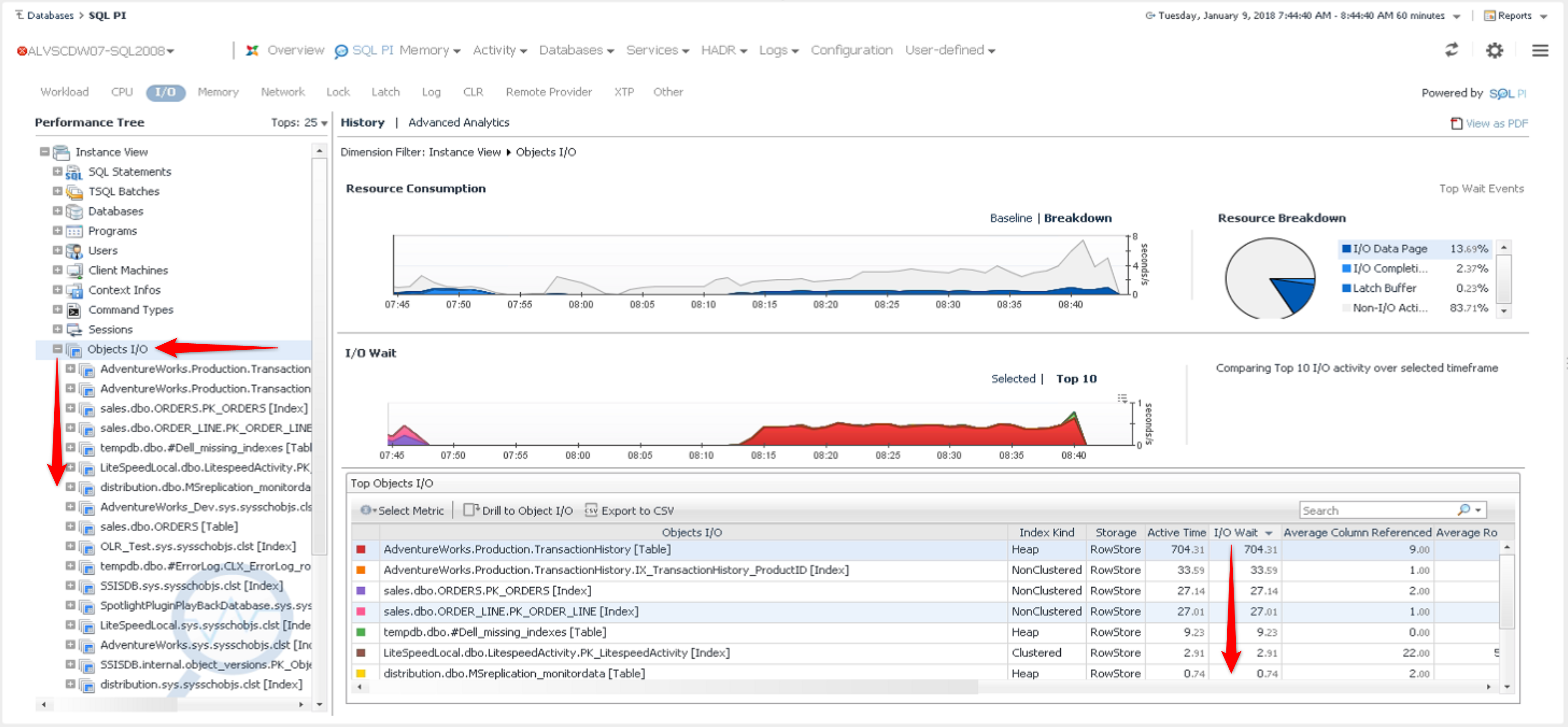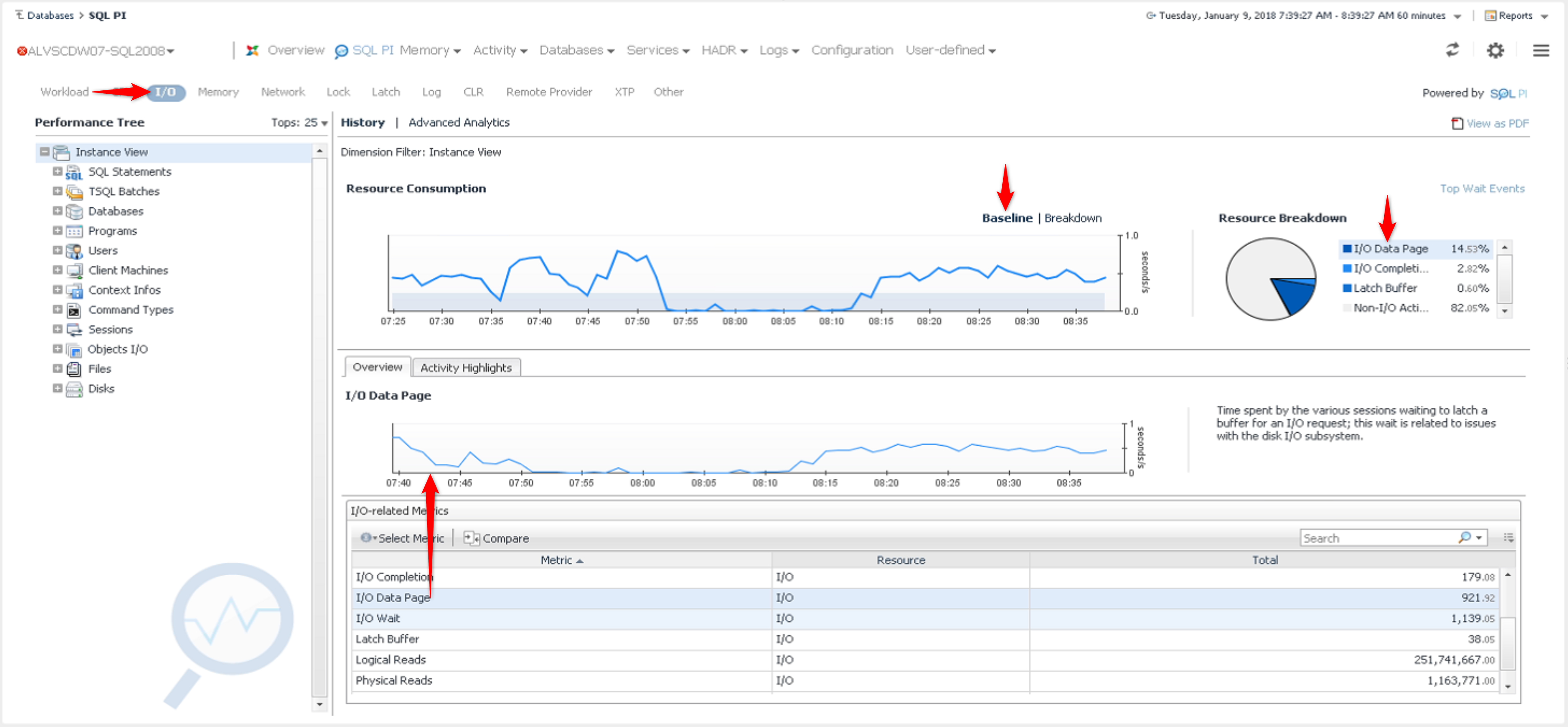 Foglight can alert you with an email when unusual IO load occurs, at which point you’ll want to navigate to SQL Performance Investigator (“SQL PI”) like this: