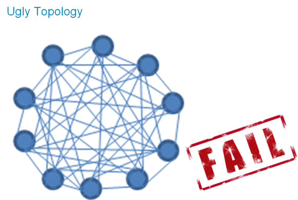 I have seen some really ugly Topology diagrams. The one that comes to mind was one that one of my customers showed me. It was a ring. I should say it was like a pearl necklace, with about 50 pearls. And they were all connected to each other. It was something like this first image. It was ugly. Or at least I think it was.