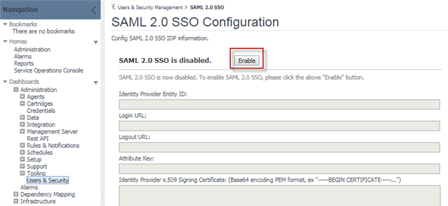 - Under Dashboards, click Administration > Users & Security, and then click SAML 2.0 Integration Settings. The SAML 2.0 SSO Configuration dashboard appears.