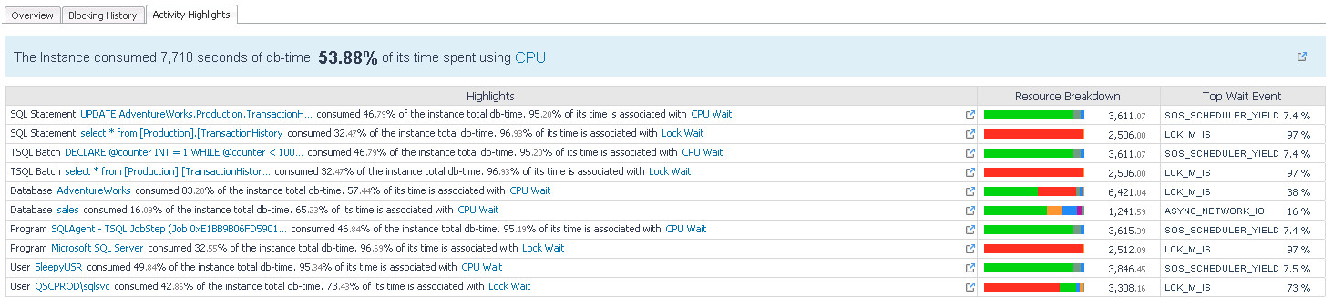- Performance Investigator (PI) Automated Highlights – Provides immediate performance analytics, to focus on the most significant dimensions (users, programs, queries, etc…) that were relevant for the resource selected in the analyzed timeframe.