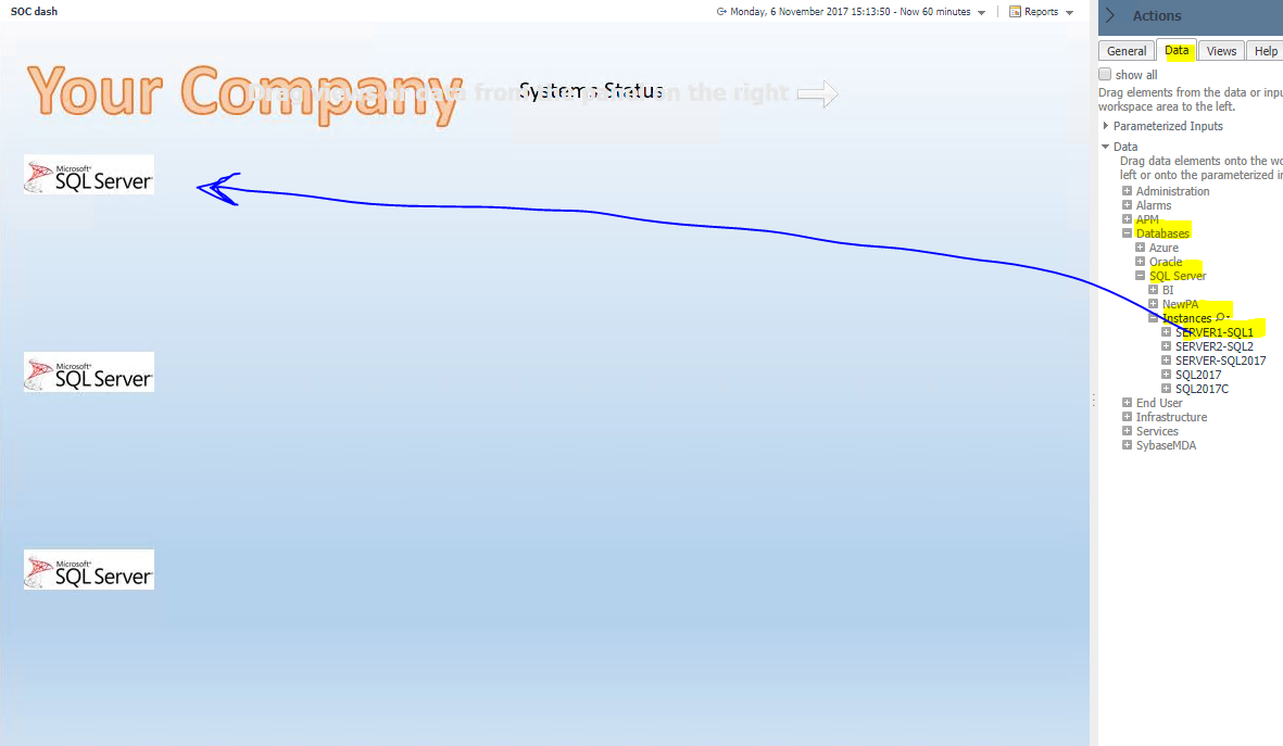 Then navigate to Actions/Data and locate your SQL instances as below