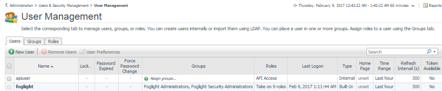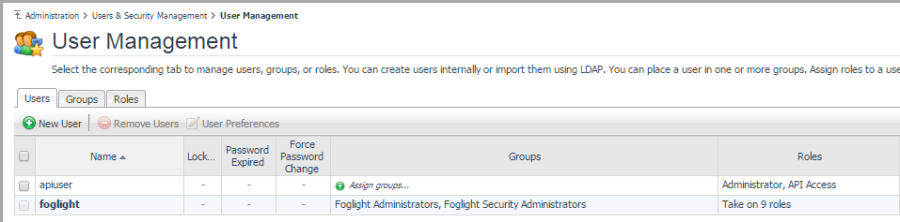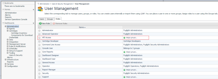 To enable REST APIs, Foglight provides a new user role “API Access” by default to manage their security. You can grant this role to any users who need the access to the REST API.