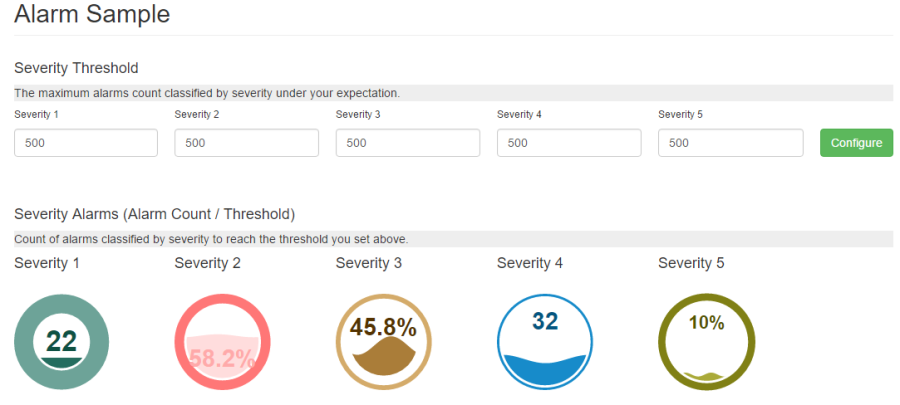 In the Alarm Samples page, you can set your tolerated alarm count as Severity Threshold. After clicking Configure, the ratio between current alarm count and Severity Threshold will be shown in the Severity Alarms section. Click Severity 1, Severity 3, or Severity 5 to clear relevant alarms, while the click of the remaining severities acknowledges the relevant alarms.
