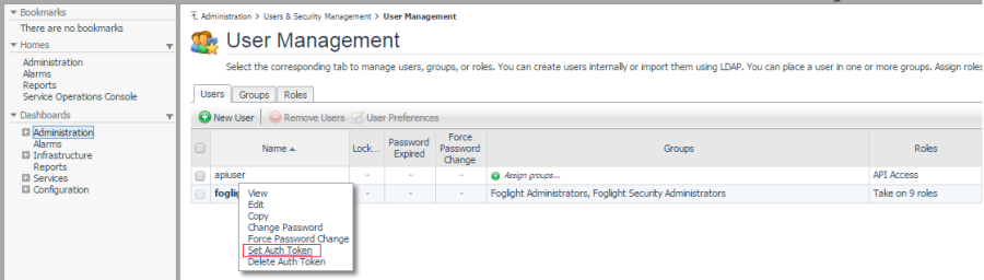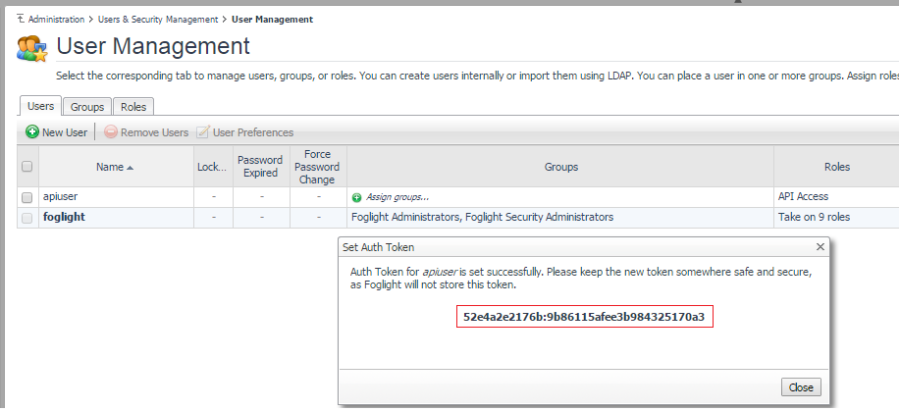Foglight 5.7.5.7 must be installed to get the token through Auth Token; otherwise, you are only able to get the token through the process described in Getting token through user credentials.  One Auth Token can only be associated with one Foglight user, and vice versa. An adminuser (a user with Administrator role) can reset or manage the Auth Token through the Foglight console. This Auth Token will be used to retrieve the access to REST APIs later.