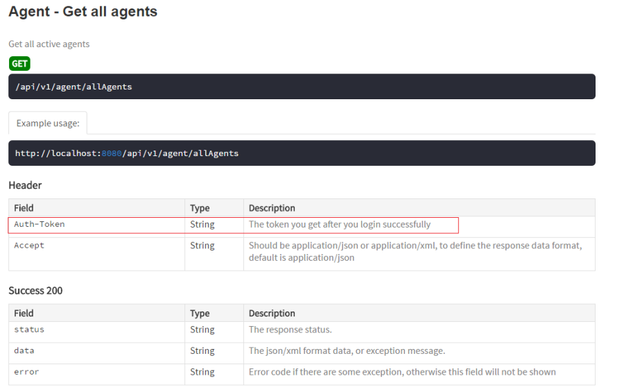 After getting a token, you can use this token to access other APIs through the security login REST API. The following shows an example of “Get all agents” REST API.