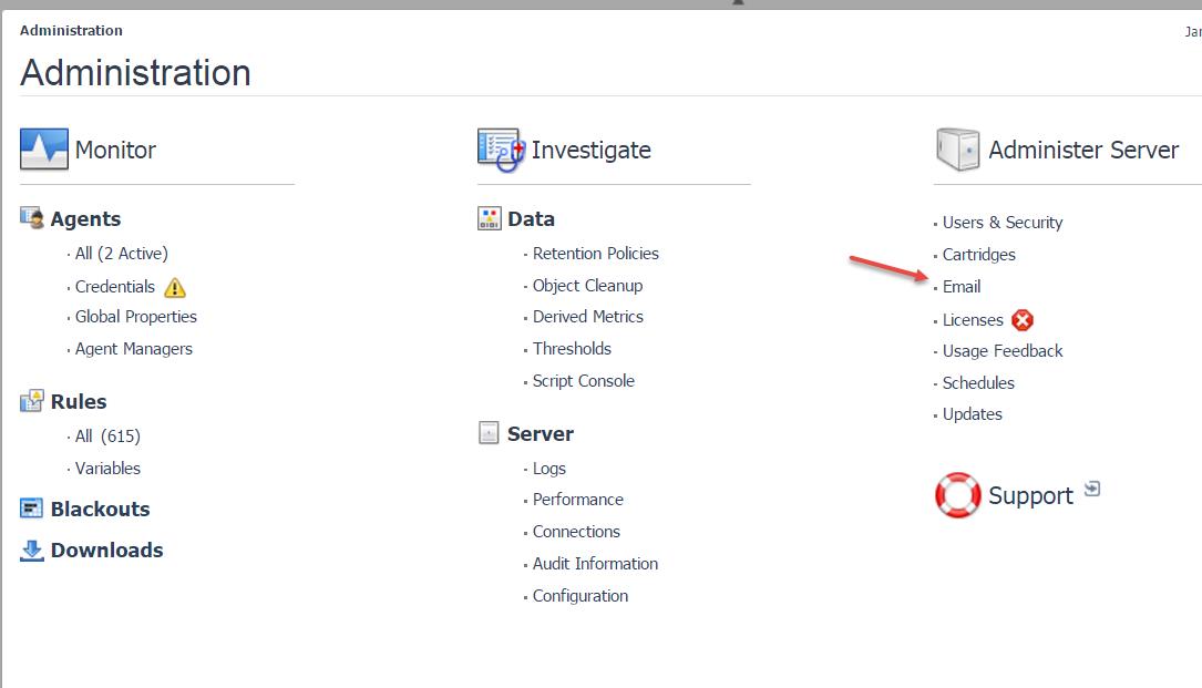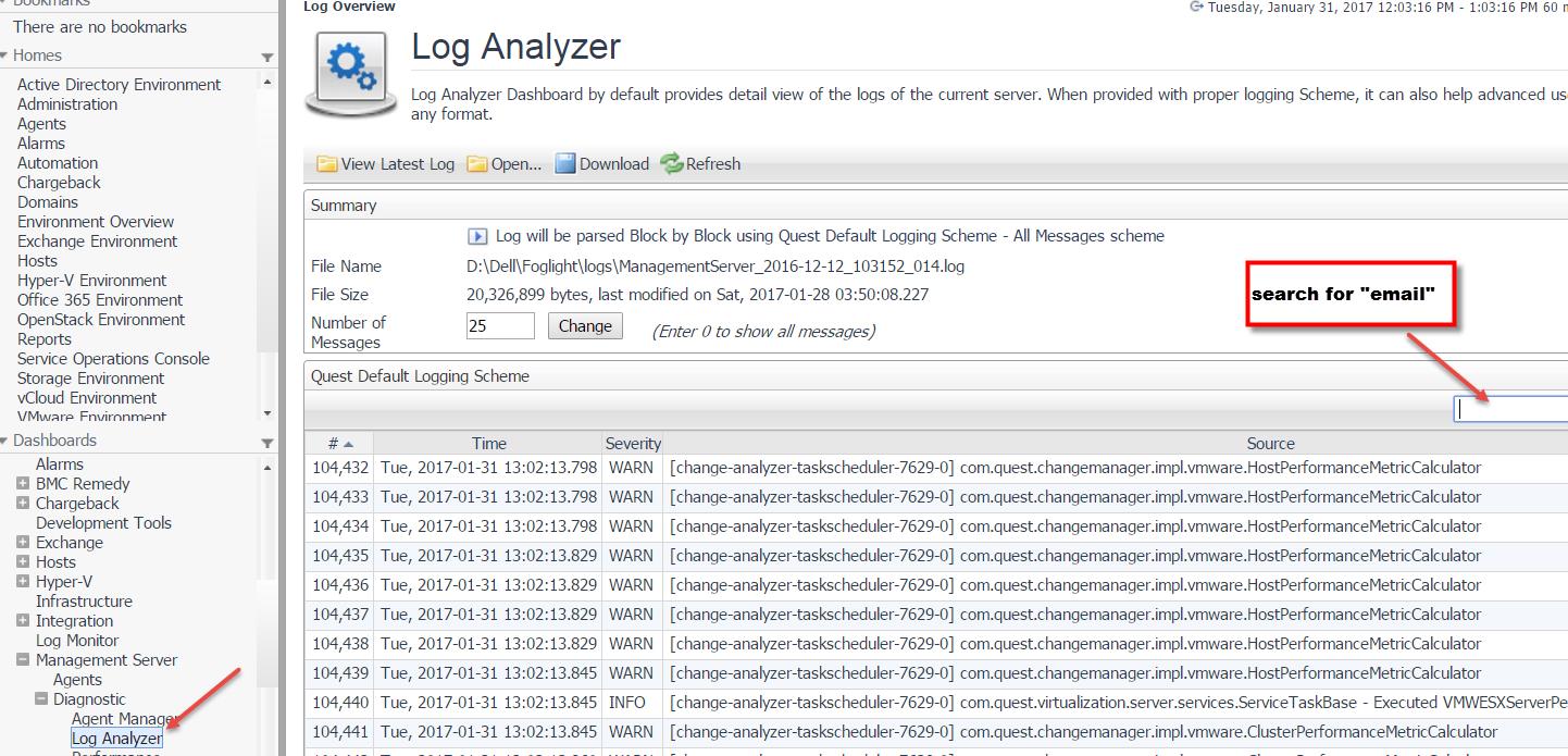 If email actions have failed, you can see when that happened by looking through the Management Server Log file on the Foglight Management Server (FMS). Emails can fail because of communication problems between the FMS and the mail server, invalid mail server name, etc. You can view this log directly from the Foglight console: