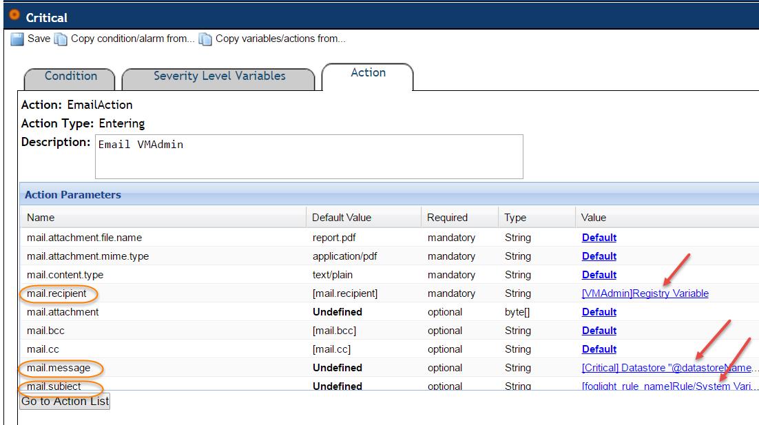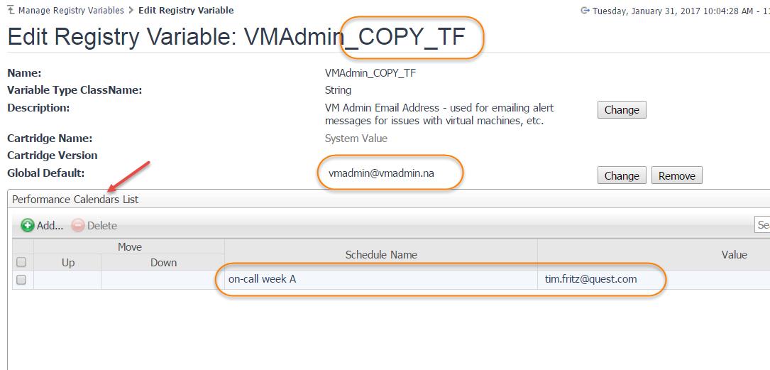 You probably don’t want to type in the destination email addresses on every Foglight rule. Variables are the answer – Foglight registry variables. Registry variables can be assigned default values, and certain kinds of override values (see this post for an example of value scoping: https://www.quest.com/community/b/en/posts/setting-different-alarm-thresholds-for-different-hosts).