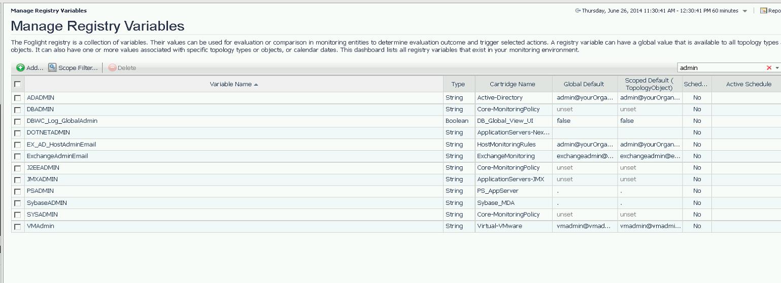 Each Foglight cartridge comes with its own default email destination variable set up: for example, j2eeadmin, dbadmin, sysadmin, or vmadmin. You can make changes to the values assigned to these variables: