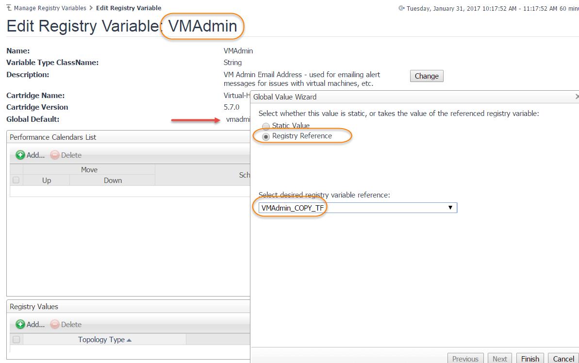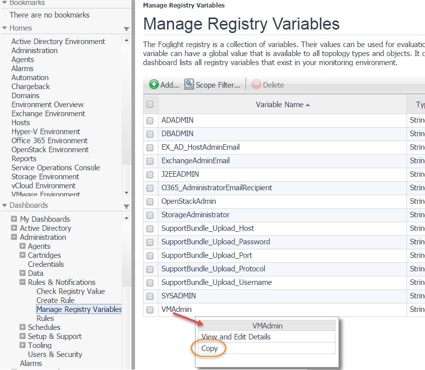 Remember, a best practice is to copy the variable to a new name, change that one, and then change the original to use a registry reference to the new variable name. This technique has the advantage of preserving your customizations of the variable through a Foglight upgrade, and you’ll be able to safely make those changes in a copy of the variable and not have to change the rule(s) that reference it. The same, out-of-the-box registry variable name will, through the registry reference, allow the rule condition to use the correct (perhaps scoped) variable value every time.