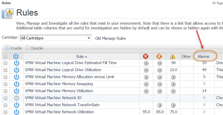On the Rule Management screen, you’ll see “Alarms” (number of time the alarm has fired in the time range).