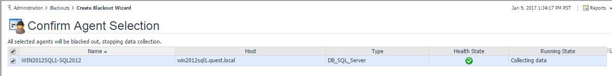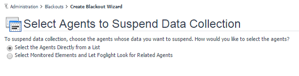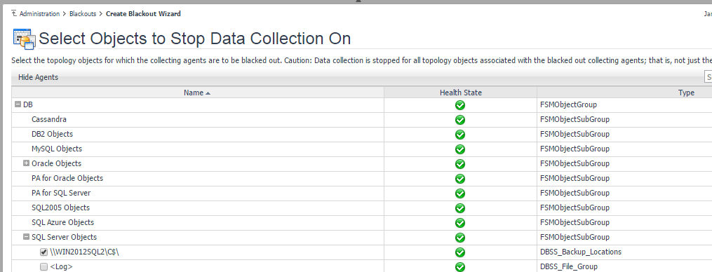 When you suspend data collection, you have the option to select a topology object. However, it’s the agent that actually gets selected. Since it’s the agent’s responsibility to gather data, the agent is turned off. Let’s see an example. If I choose to suspend data collection and click the Next button, I see the following: