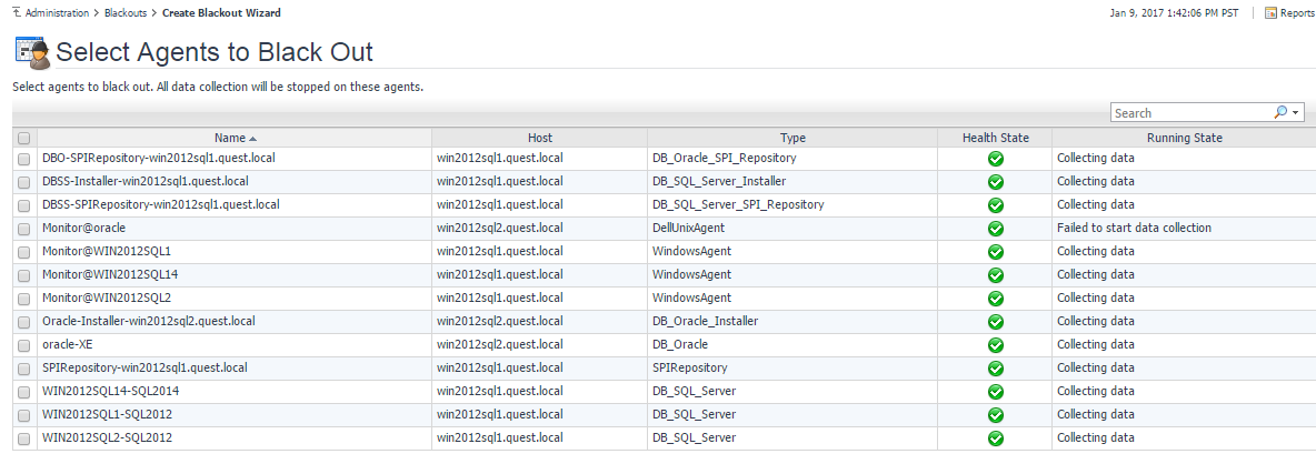 As you can see, Foglight is telling me that, because I’ve chosen to suspend data collection, I actually have to chose the agent. By selecting a topology object, Foglight will do the heavy lifting for me to discover the related agent and display it on the screen. If I had chosen to select the agent, as opposed to the monitored element, I would see the list of agents currently deployed in Foglight: