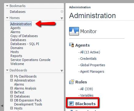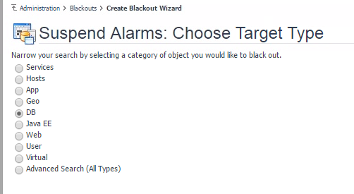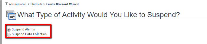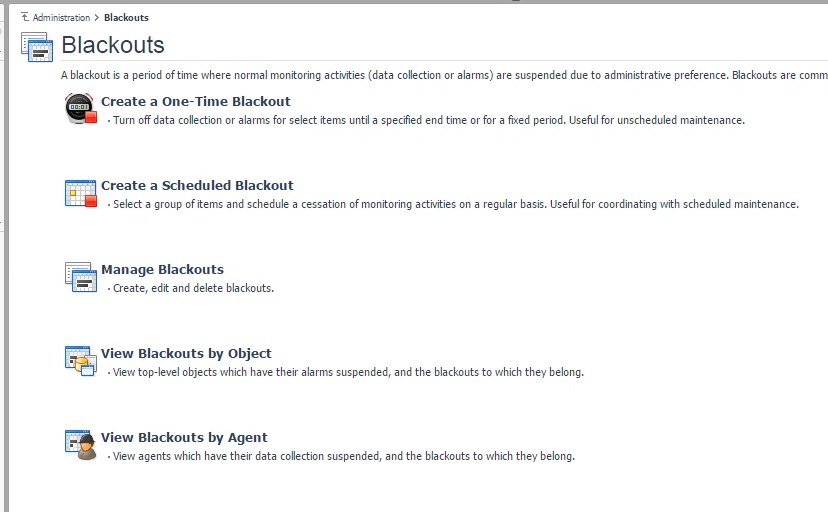 The remaining options allow management of previously created blackouts. When you create the blackout (either scheduled or one-time), you have to choose whether to suspend alarms (the processing of rules) or suspend the collection of data. These are the options I discussed previously: