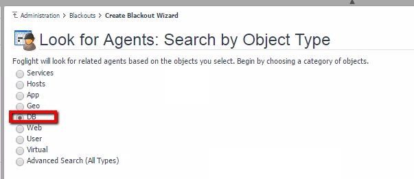 Clicking Next will expose database the category of topology objects within Foglight. The topology objects you’ll see are based on the cartridges you have installed in Foglight.