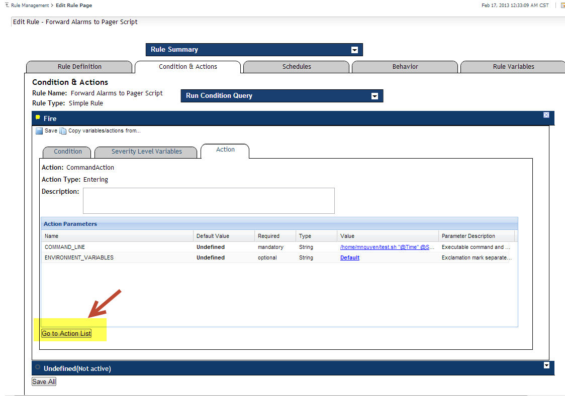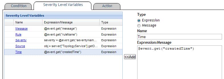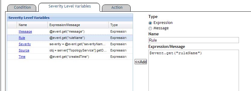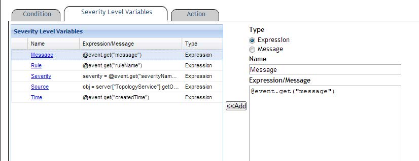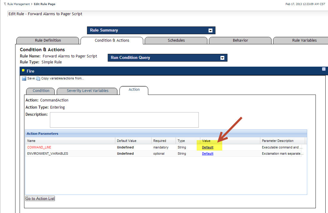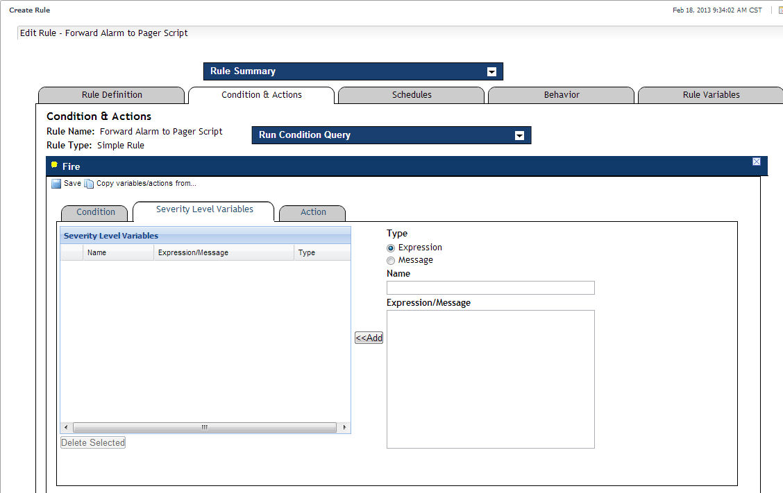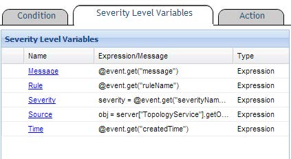 - Go to the Condition & Actions tab => Severity Level Variables to define parameters to pass to the pager script.