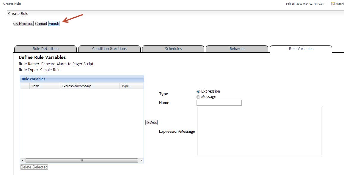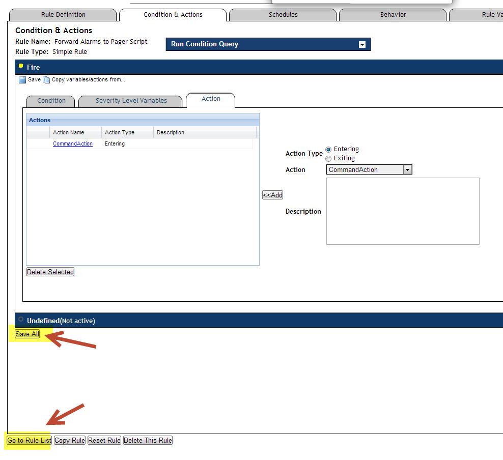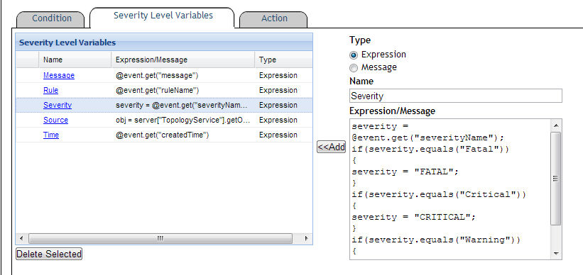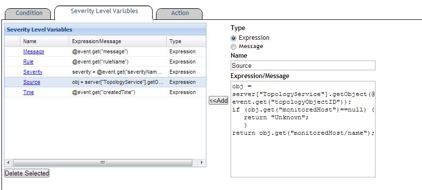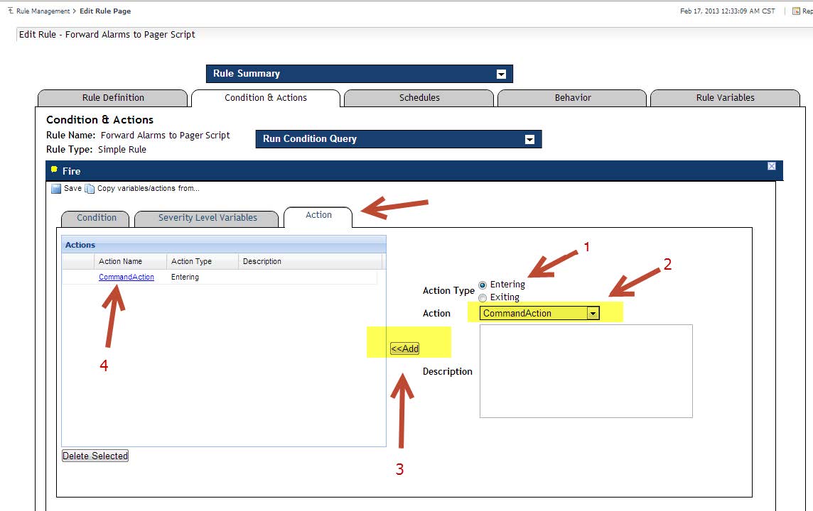 - Go to the Condition & Actions tab => Severity Level Variables to define parameters to pass to the pager script.