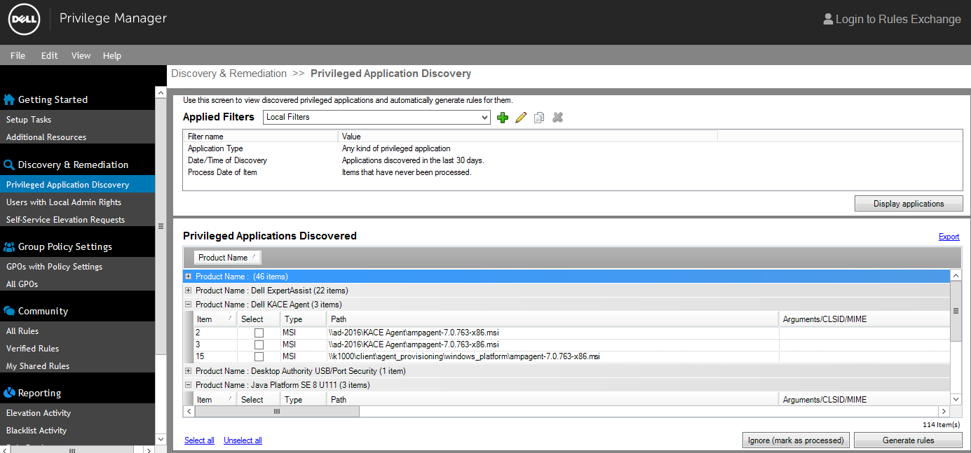 Figure 2- Using Privilege Manager for Windows I am able to view what applications users need administrative rights for. This will help me create the exceptions so that I can remove the local administrative rights.