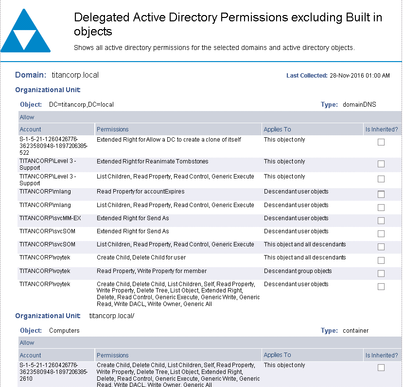 Figure 10- This is a report with Quest Enterprise Reporter that I customized to exclude built in account so show me native delegation points in Active Directory.