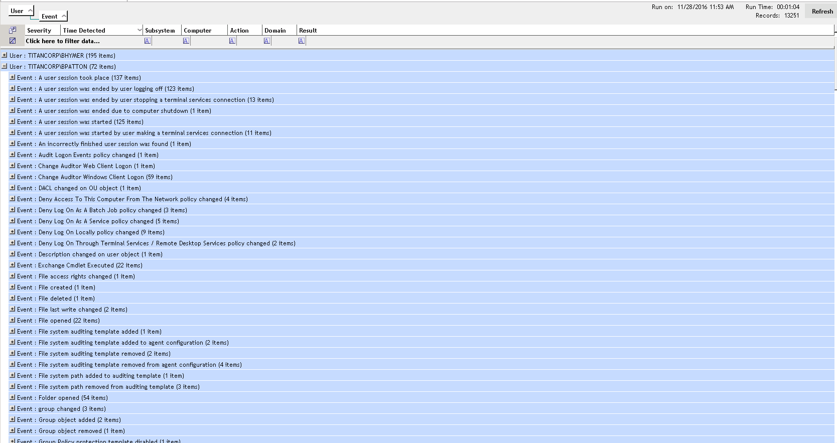 Figure 1- Using Quest Change Auditor I am able to audit what the members of a group have done over the last six months. This data can be used to create policies as you now know what functions these users normally perform.