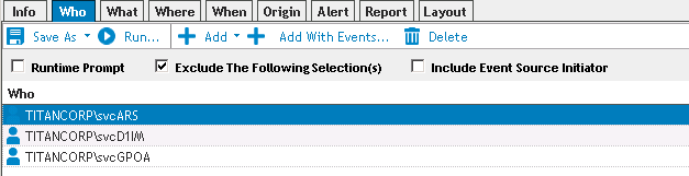 Figure 12- An organization can use Change Auditor to show changes that happened outside of their service accounts. This will reduce a lot of noise so you can easily see who is going outside of your organization policy to make changes in Active Directory. You could setup multiple alerts as your Identity Management and AD management service accounts should only be used from specific machines acting as a proxy into your environment. If these accounts are ever used on another machine, an alert would be beneficial.