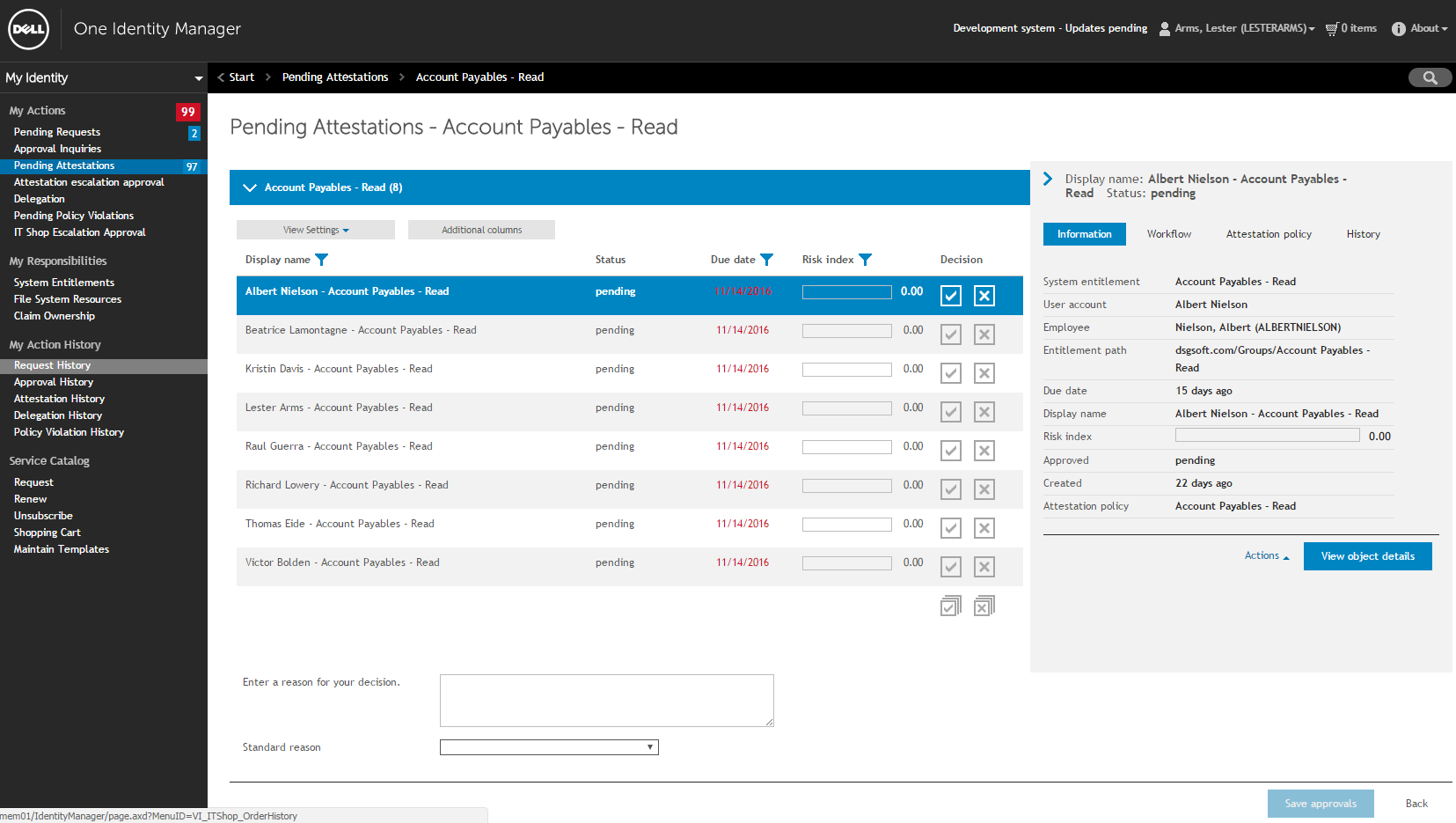 Figure 14- Here is an example of an attestation on a group in Active Directory that is granting access to data for Account Payables. When the business owner clicks deny for an individual, that individual will automatically have their permissions revoked from that entitlement.