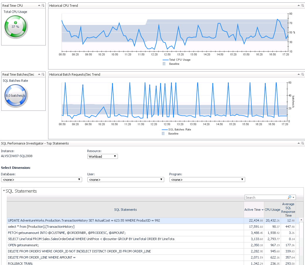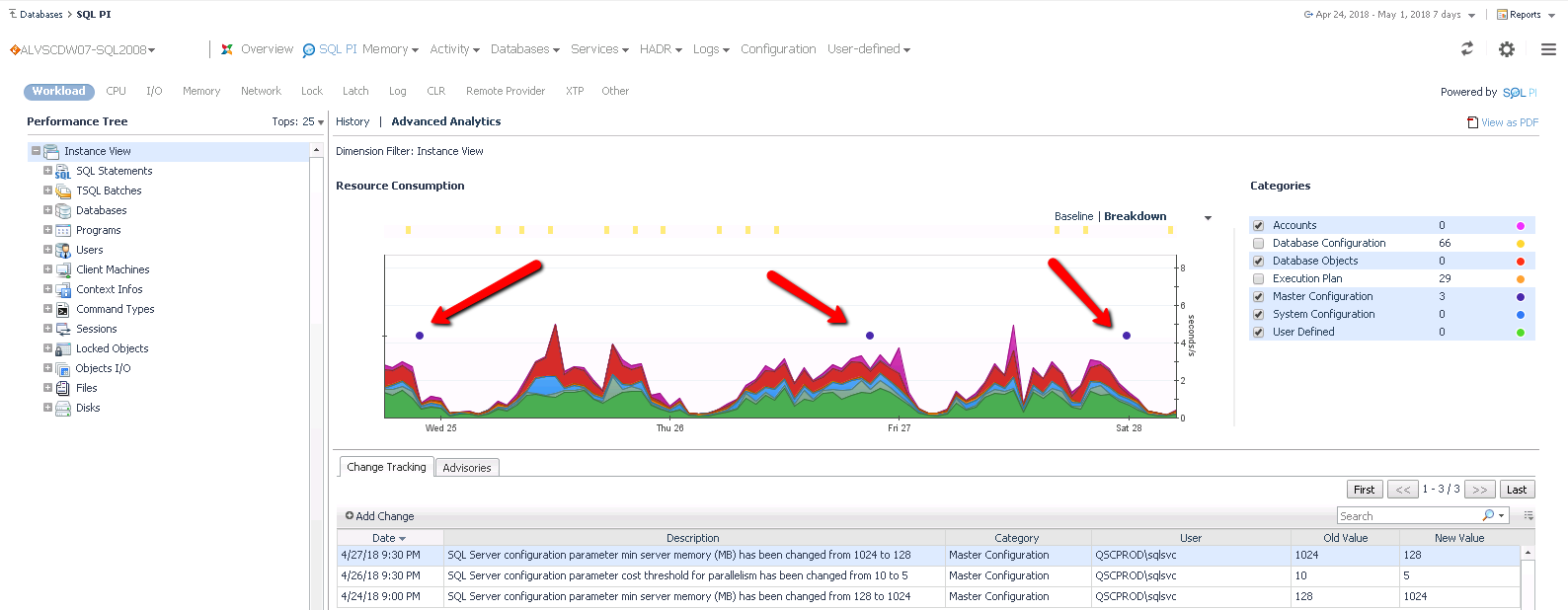 Foglight for Databases (specifically SQL Server and Oracle), provides a Change Tracking feature in the Performance Investigator (SQL PI) drilldown, which will very clearly show what is changing, and because the change event is overlaid on top of a workload graph, DBA’s can visualize the impact of that change. This can assist with “reactive” problem detection, in that if a change occurs that causes a performance problem, the DBA will quickly realize this and be able to work with the development team to back out that specific change. This also helps with more “proactive” diagnostics in that after a change occurs, a DBA will be able to view the before and after status of performance. If things start to trend in an unhealthy direction, they can work to fix the problem before it affects end users.