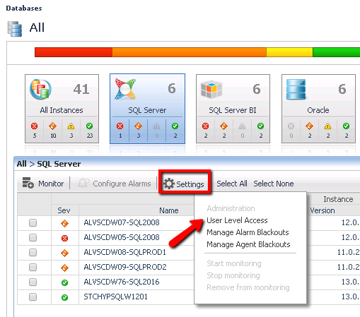 First off, Foglight provides a “User Level Access” control, that enables an administrator to provide full access to Foglight’s dashboards and drilldowns, but only for a restricted set of servers. If a DBA wishes to allow a developer to look broadly at the health of a database server, but only the servers that they are directly responsible for, that can be accomplished using the configuration option shown below: