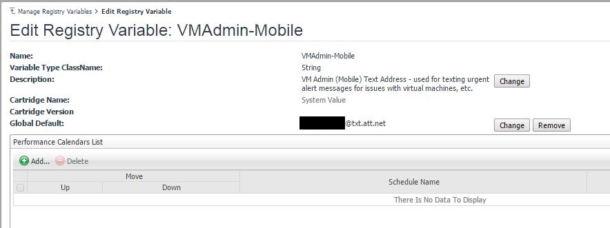 Step 1: Creating a new registry variable is the easiest way to “create a contact” within Foglight that we’ll use as the recipient address in a later step. To make a new registry variable, navigate to Dashboards > Administration > Rules & Notifications > Manage Registry Variables. You can add a new registry variable, or copy an existing one. In this example, I copied the variable “VMAdmin” to “VMAdmin-Mobile”. I updated the default value of the variable to reflect the email-like SMS address of my mobile device.