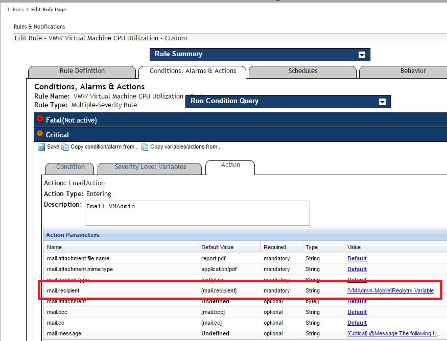 Step 3: Now, let’s customize the newly created rule. First, we’ll want to update the recipient of the email generated when the rule fires. We can do this by editing the rule, selecting a severity, and then navigating to the Action tab. After selecting EmailAction, update the mail.recipient parameter to reference the new registry variable we created in step #1.