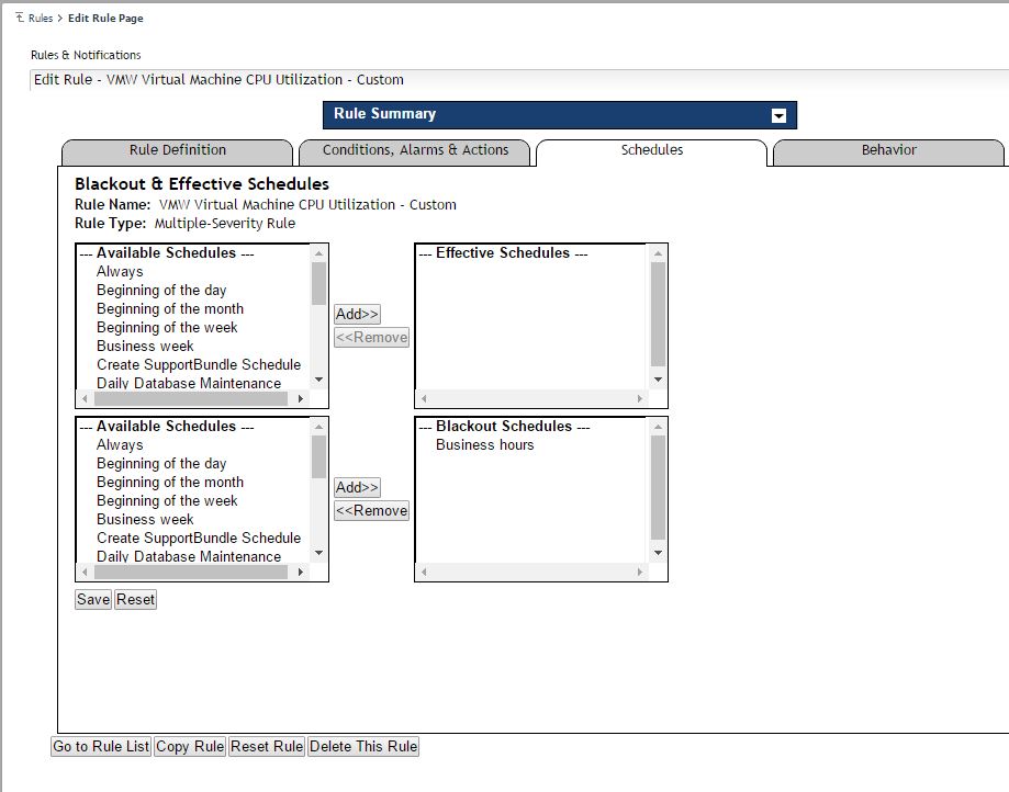 Additionally, we can also customize this rule to only be valid outside of business hours (i.e. nights and weekends). Do so by by heading to the Schedules tab and adding “Business hours” to the Blackout Schedules.