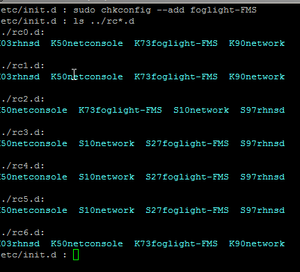 And finally you need to add the scripts to the needed rc*.d directory. Easiest way to do this, is use the chkconfig tool. In the foglight-FMS script you will find the needed chkconfig details added. Please modify them as needed, that they fit in your setup: