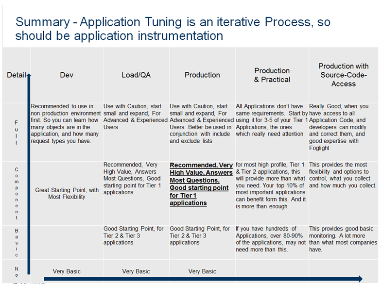Our default should have been ComponentDetail, specially for large volume Production environments. That is how most of our internal demo environments are set up and for very good reasons. It provides the flexibility, and the most acceptable overhead, especially for the most important Business Critical applications. As we all know Java monitoring is intrusive. So if one is not going to actively using the information, and not using the information for hours at a time on daily basis for analysis, this is my favorite option.
