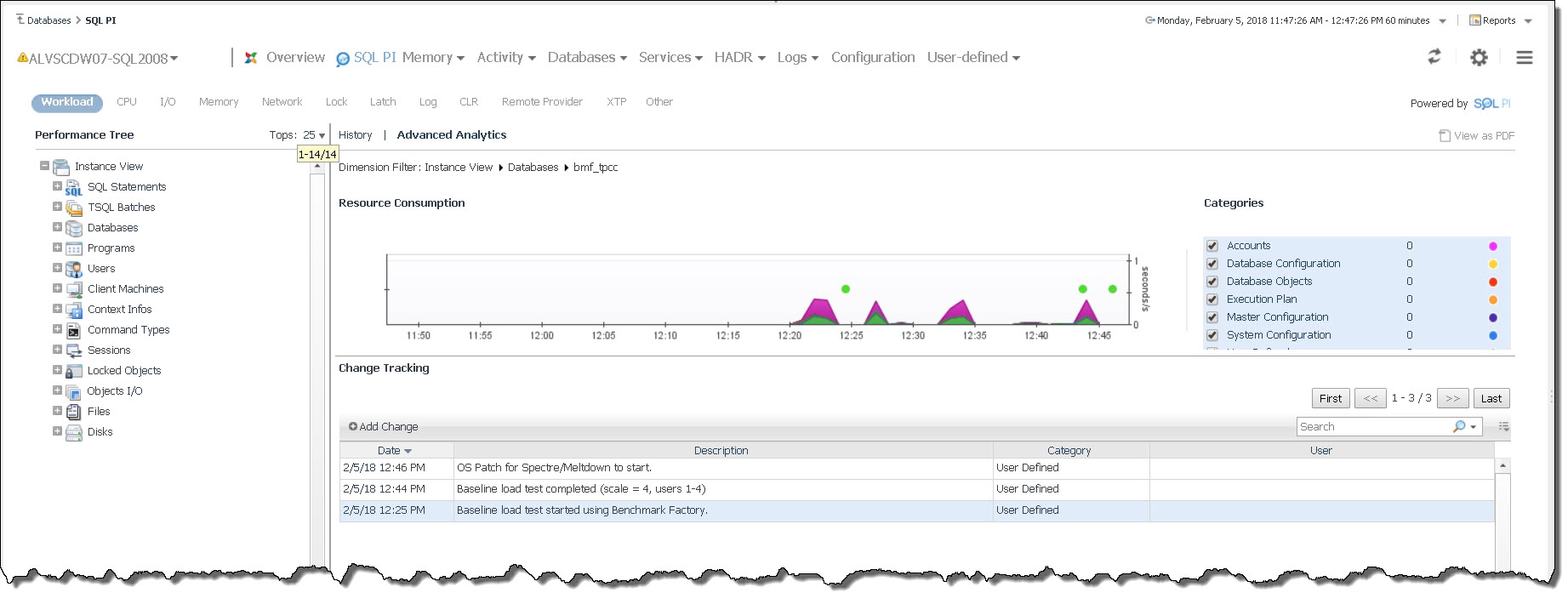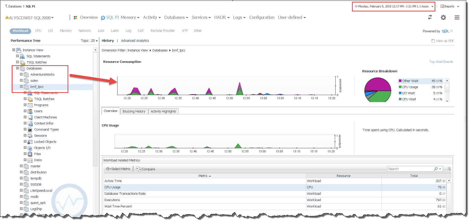 In Foglight, we can drill into the workload, isolate the database that was used for the load test (“bmf_tpcc”) and view the resulting impact on our SQL Server instance.