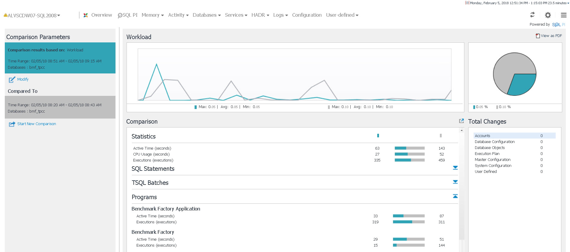Finally, we can compare the workload impact on SQL Server between our 2 test runs using the Compare feature. We simply start with the latest available performance data (test 2) and compare it to the time period of test 1. This will let us quantify the impact between the changes. Performance comparisons can also show the differences between specific Programs, SQL Statements, etc. so that you can pinpoint exactly what was impacted.