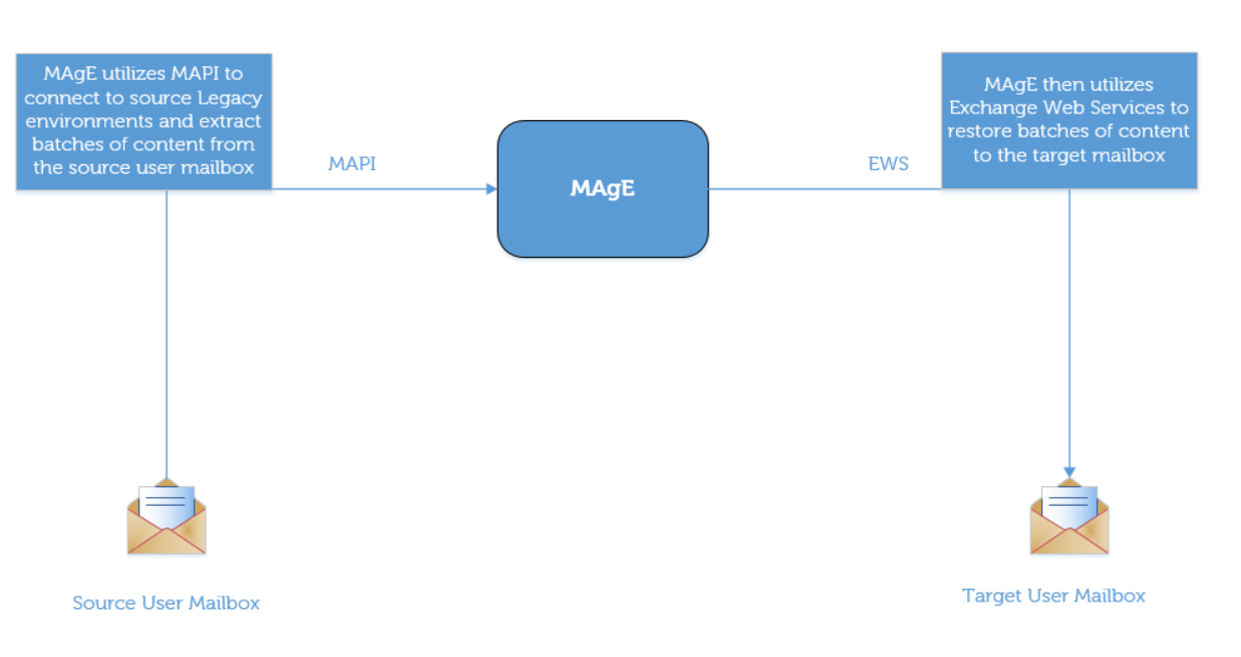 In the wake of the release of Exchange 2013 and Office 365, Quest offered a newer re-design of the Migration agent architecture known as MAgE (Migration agent for Exchange). This new architecture consolidated the agent from three components to deploy to one, for Mailbox and Calendar. Also, utilized EWS as its connection method to Exchange versions 2013 & Office 365. Operating over a well-known web port, we broke some barriers allowing the solution to work in cloud based (Target) environments, whereas Legacy could not. Further improvements simplified the agent deployment and moving agent database storage from a local MS Access database to a single SQL database. This made changes to configurations and reporting much faster and flexible. One caveat is, that Public Folders still required MAPI connections/agents.