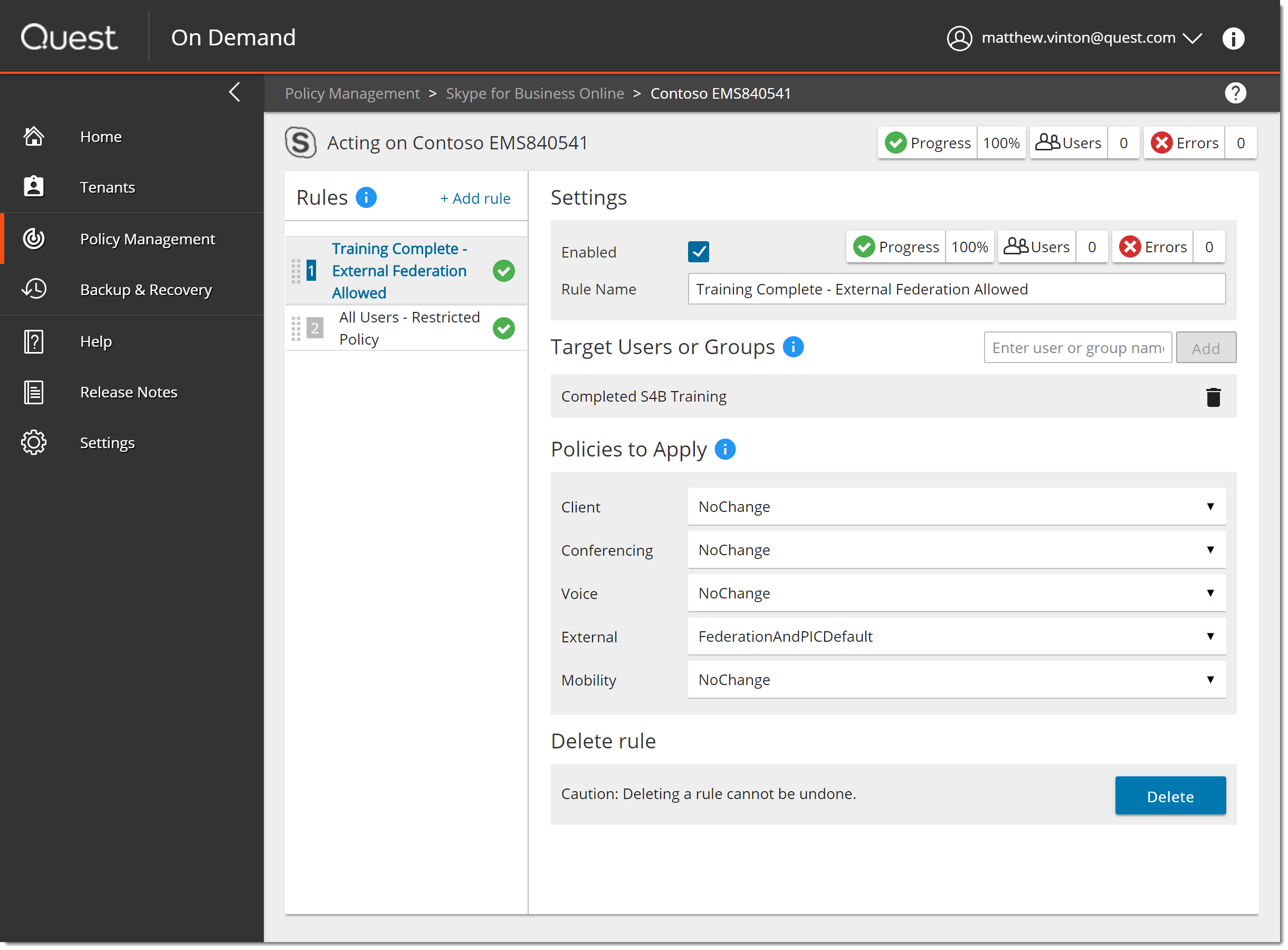 That choice becomes a little easier with Quest® On Demand Policy Management. From a single SaaS interface, your organization can enable Exchange Online and Skype for Business Online capabilities in a systematic, audited way. Let’s look at an example.