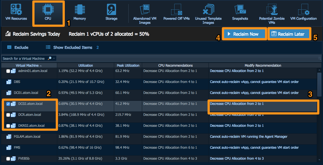 CPU category (1) will list vCPU right-sizing recommendations across virtual datacenter(s). Sysadmins may select one or multiple VMs based on VM name and then reference to recommended modification. In this case, my DC02(2) virtual server is provisioned with 2 vCPUs, and because peak CPU utilization is very low on that server, Optimizer is recommending (3) that we modify this server by decreasing CPU allocation from 2 to 1.