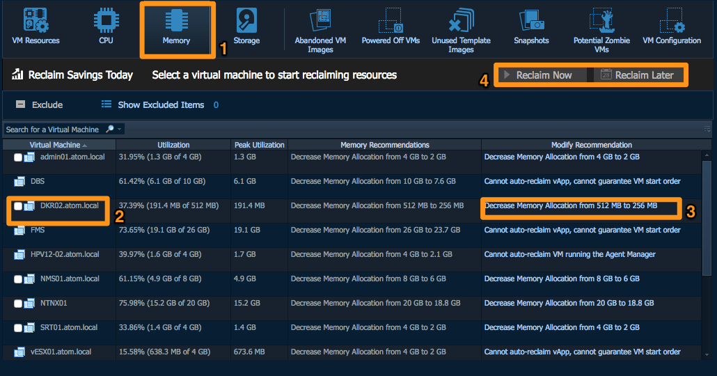 The concept behind right-zing memory (1) allocation to virtual servers is very similar to CPU right-sizing. However, this allows sysadmins to manage resource allocation with more granularity. For example, DKR02 instance in this datacenter may be excluded from CPU recommendations, but we want Optimizer to watch for memory recommendations. Similarly, if we are satisfied with recommended modification, we can go ahead an implement it now or schedule it for another time (4).